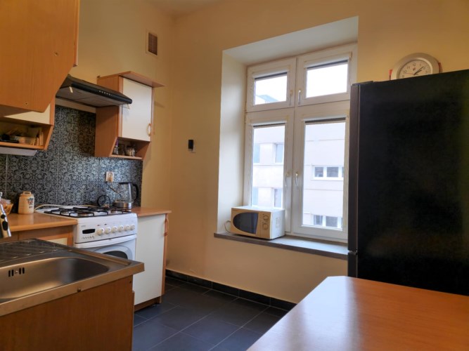 Mieszkanie o powierzchni 34,66 m2 (w księdze wieczystej 37,64 m2 wraz z piwnicą) usytuowane na trzecim piętrze czteropiętrowej kamienicy z 1902 roku.