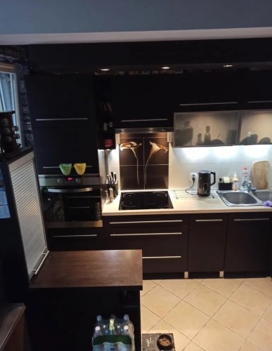 Kuchnia połączona z pokojem, umeblowana i wyposażona.
