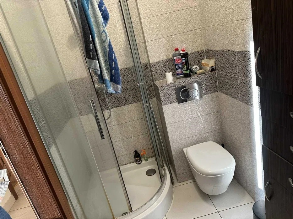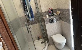 Łazienka (ok. 4 m2) z kabiną prysznicową oraz wc.