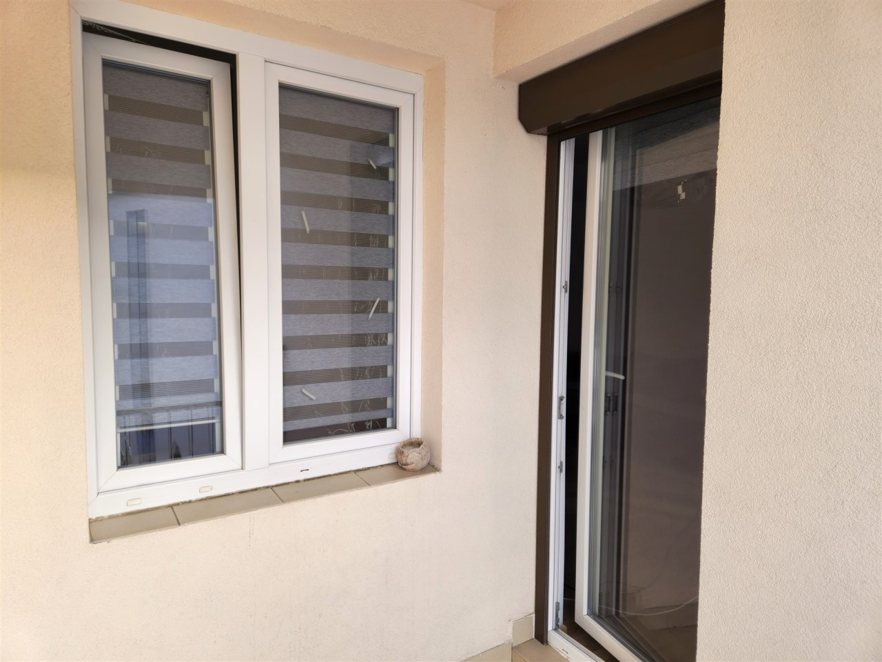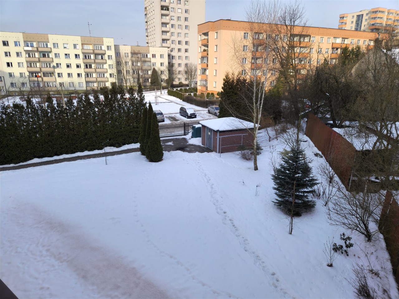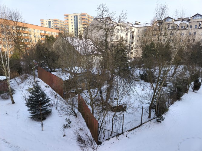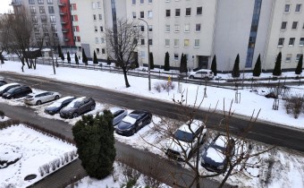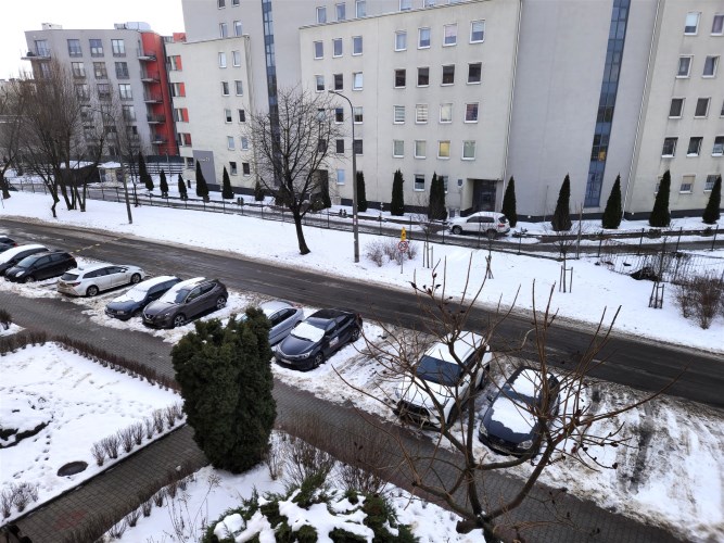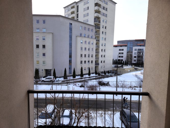 Duży pokój z loggią oraz kuchnia wychodzą na drogę wewnętrzną, sypialnia wychodzi na prywatny pas zieleni.