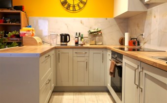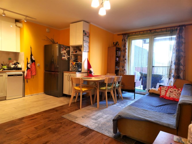Kuchnia połączona z salonem, umeblowana i wyposażona.