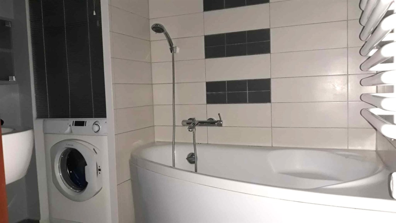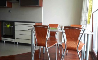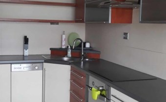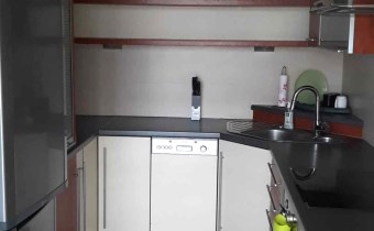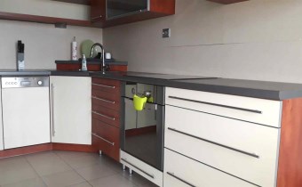 Kuchnia z pełnym wyposażeniem (lodówka, zmywarka, piekarnik, palnik elektryczny) częściowo połączona z salonem.